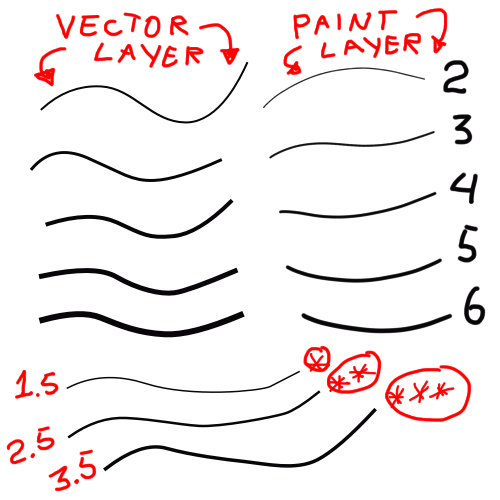 For certain contours that require straight lines and precise curves I use vectors. At this point a problem arises. Contours made in paint layers tend to come out different from contours made in vector layers, even though the brush has the same thickness, see the comparison: