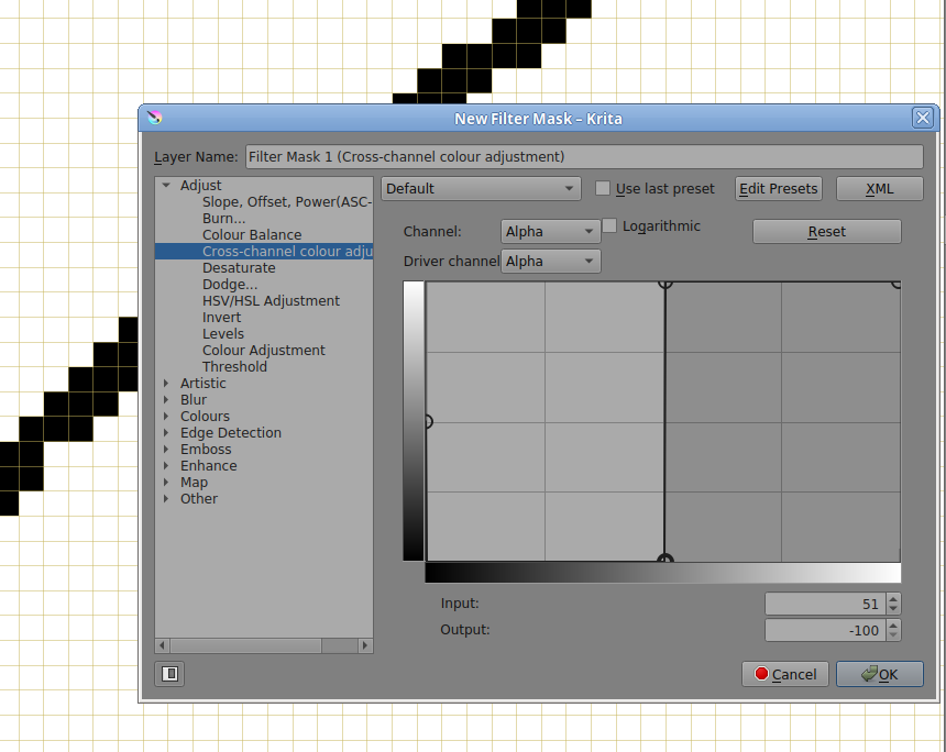 When the New Filter Mask window pops up, choose Adjust → Cross-channel colour adjustment. Then select the Channel to be Alpha. Also select the Driver channel to be Alpha though I’m not sure if that’s absolutely required.