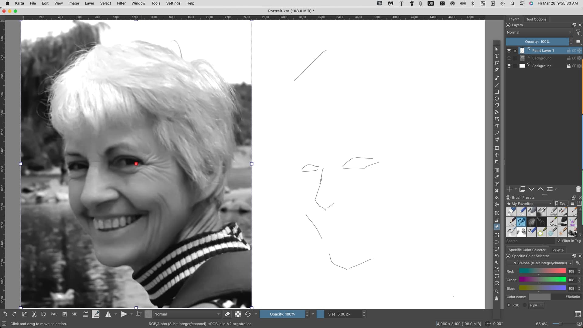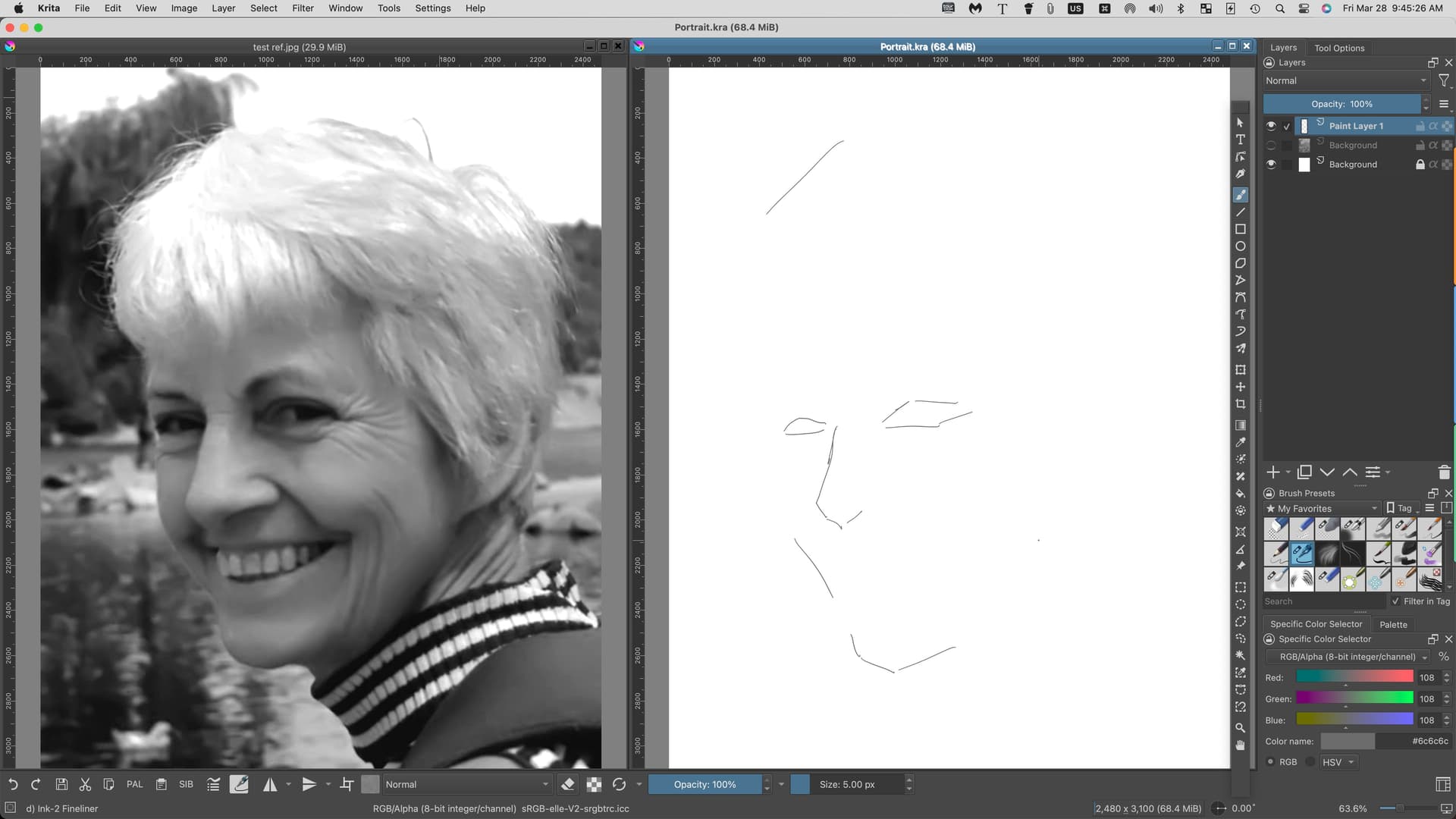 This image shows how I’ve been doing my drawing. That is, I have the reference in a separate window (this reference is mine), and I Tile the windows, thus having the reference and drawing side-by-side, both being the same size: