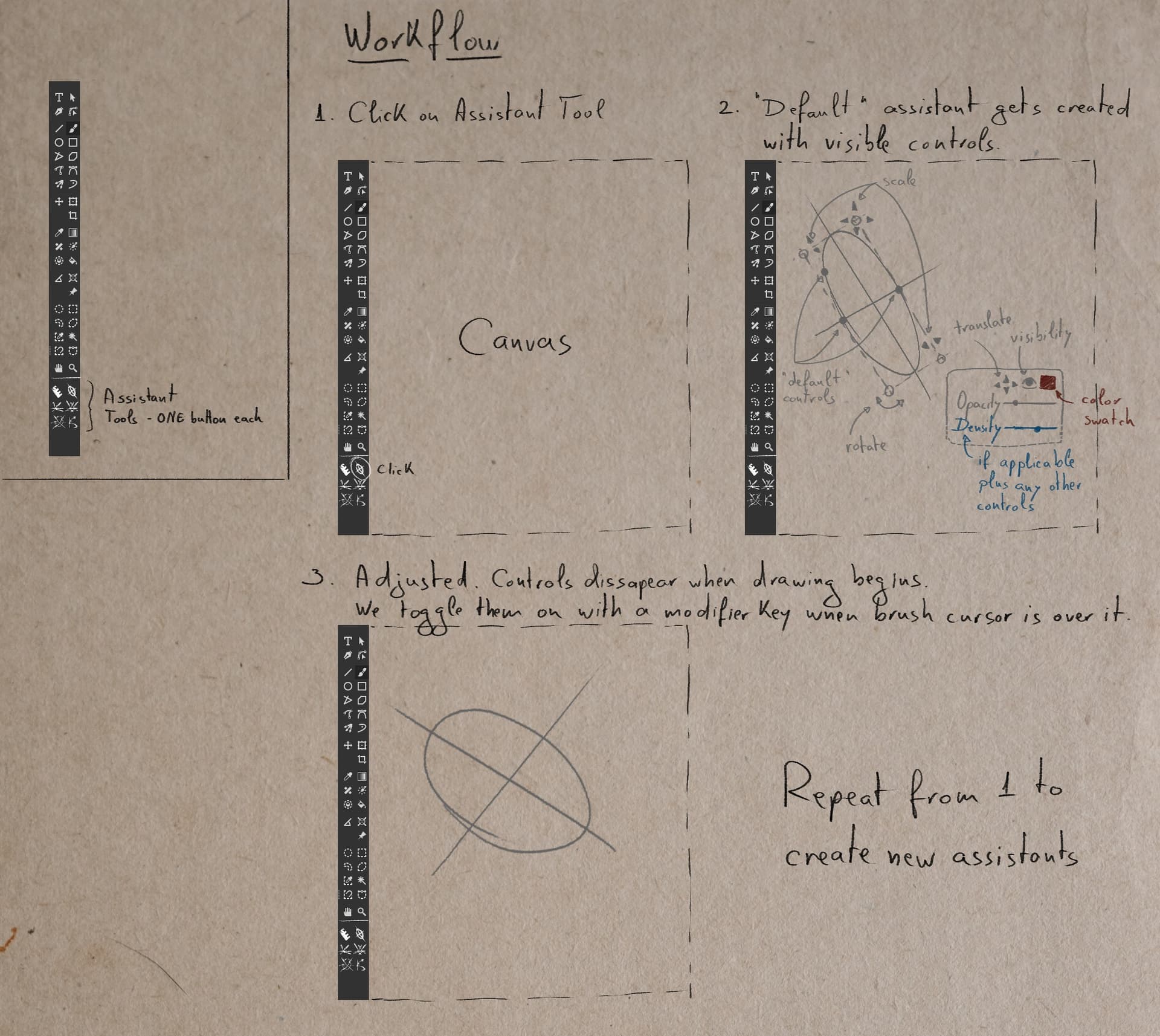 That would give plenty of feedback that such an assistant is enabled. It can’t be a tool either, because it has to be a sub-mode for the brush tool (to work like Sketchbook).