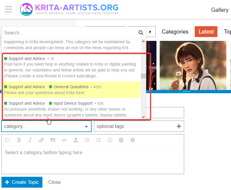 After you click the button to start a new topic, the system asks you for the category. When you click the down arrow in the category section and scroll through all the category choices, there is a definition on your screen for each and every category. That is how we are able to keep things so well organized in this forum.