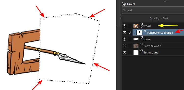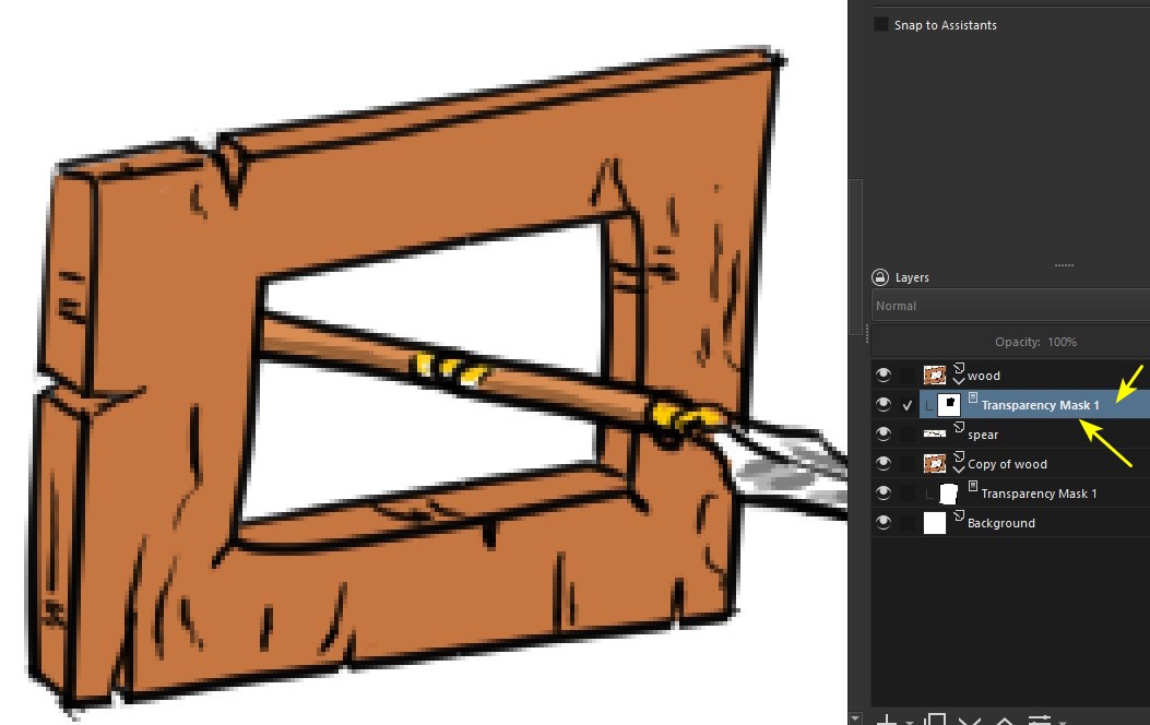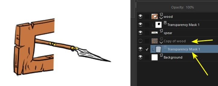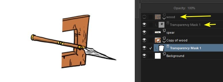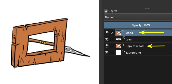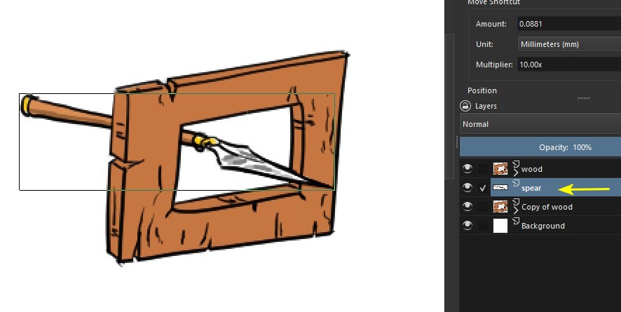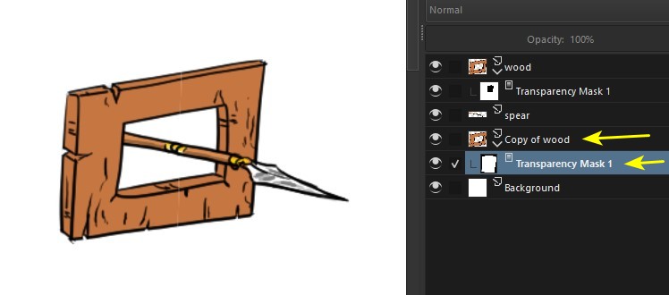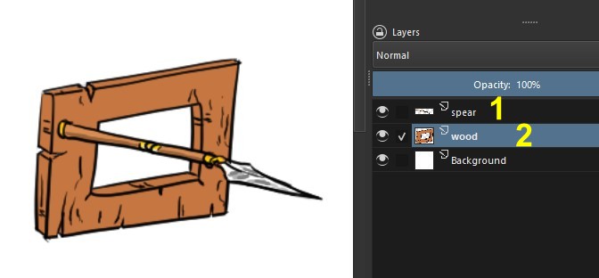 Here’s a way to solve the problem, using the hierarchy (i.e. the order) of the layers. In this example, I have a spear (1) and I want to make it go through a hole in a piece of wood(2).