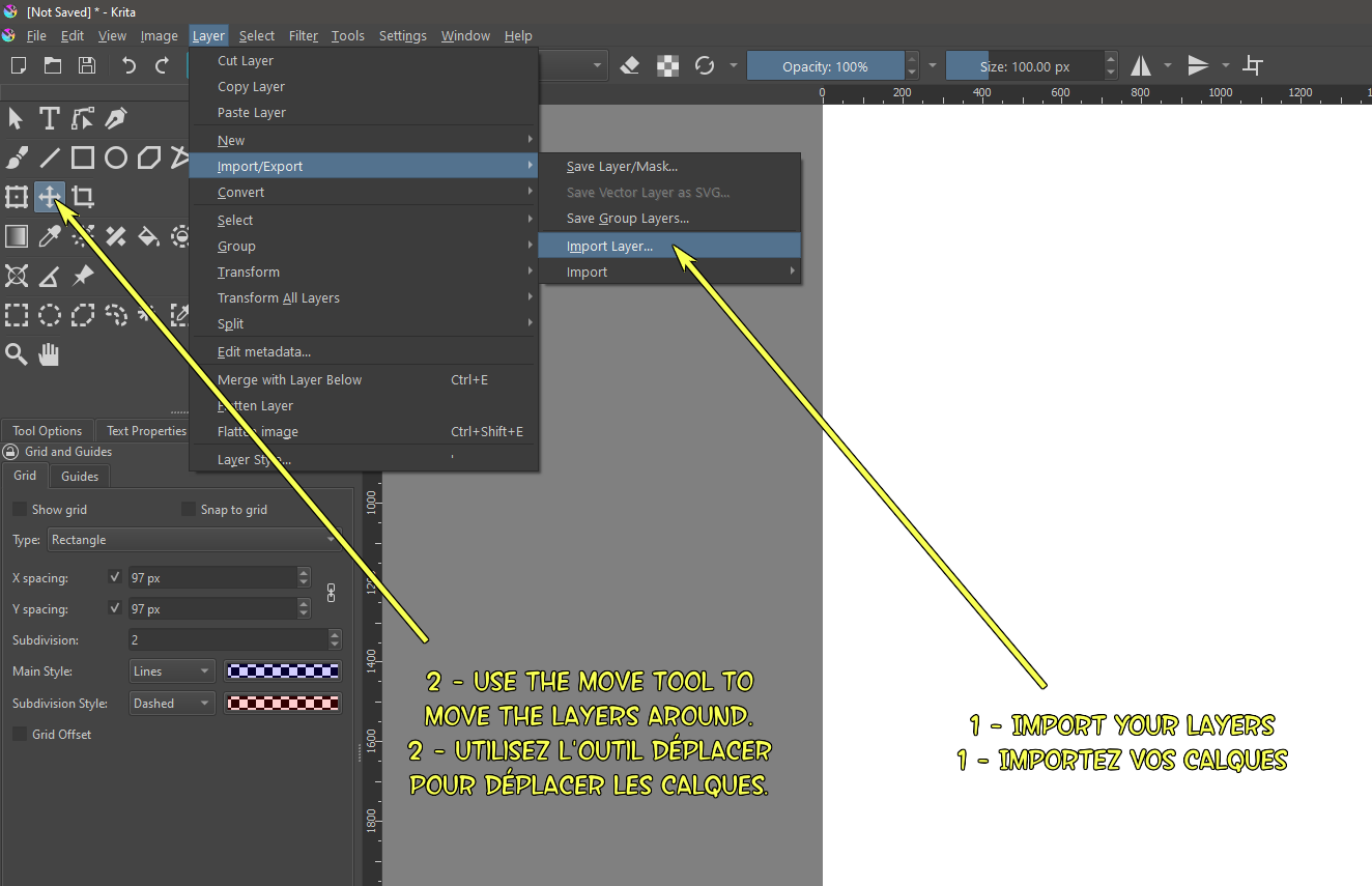 I’ve just discovered Krita (in French) and after several tries, I can’t manage to merge several photos into a single image and then move them around.