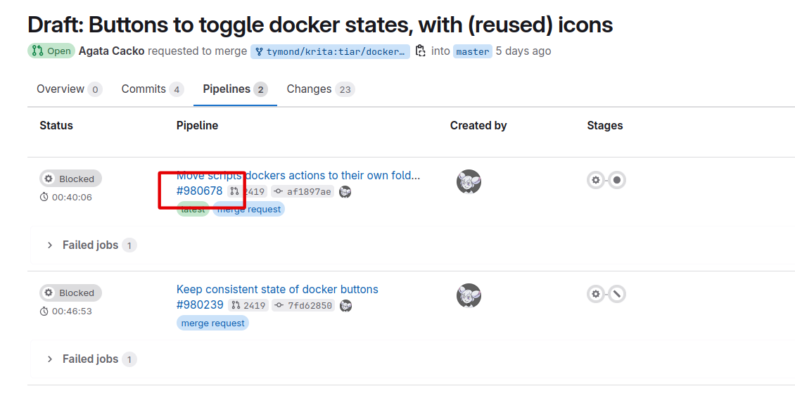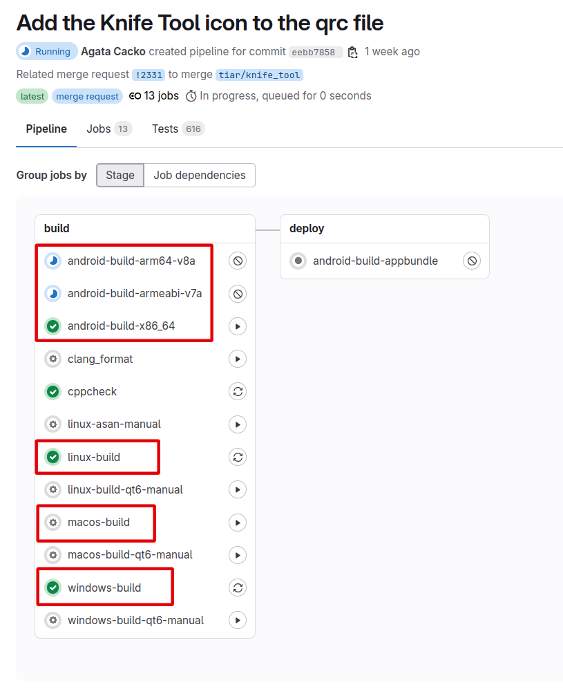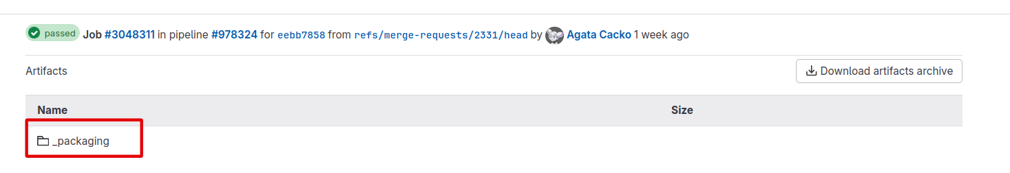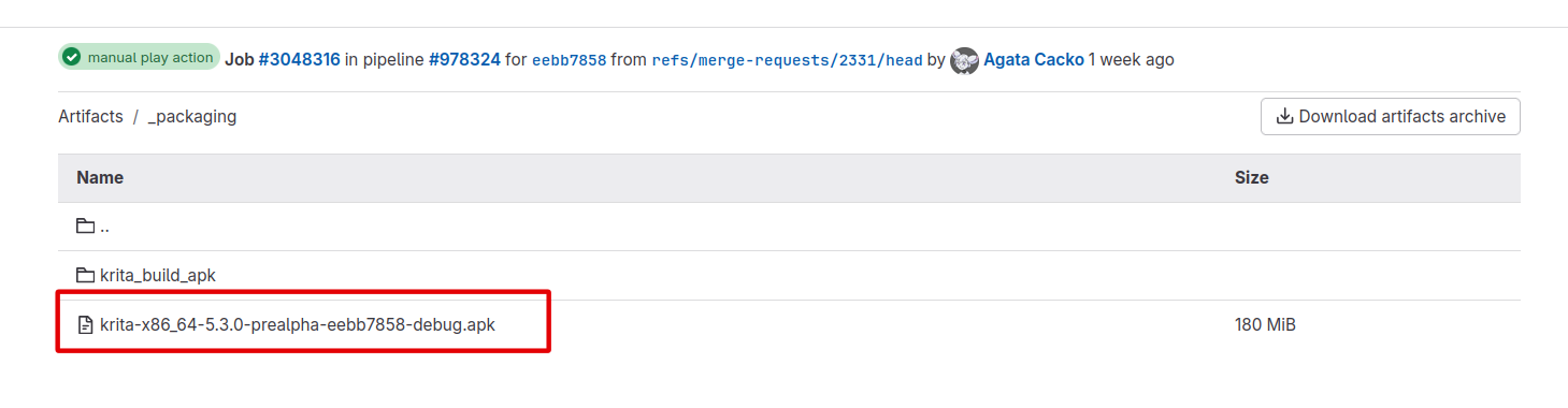 Note that the builds only last for a week (or two?..), so if a Merge Request wasn’t worked on for some time, or you want to test an older commit, in which case you need to ask a developer to rerun the pipeline for you (it doesn’t have to be the same developer, just someone with the rights to rerun it).