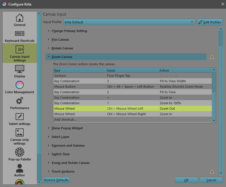 I’ve been drawing on a cintiq 13 tablet for 9 years now. And I’m used to moving the stylus left and right when zooming. I found very old post on reddit where people changed this parameter. There you had to change the kritarc file. But since the program has changed in 7 years, this no longer works. Is it possible to change something in the new version of kritarc? Or for the developers to add this functionality? I’m sure many people were grateful for this. And the transition between Photoshop and kritarc became easier.