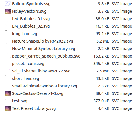 You need to put these SVG files in Krita’s resource folder’s sub folder symbols, and then start Krita, in case you can not import them using the usual method via ‘‘Settings’’ >> ‘‘Manage Resources…’’ >> ‘‘Import Resources’’.