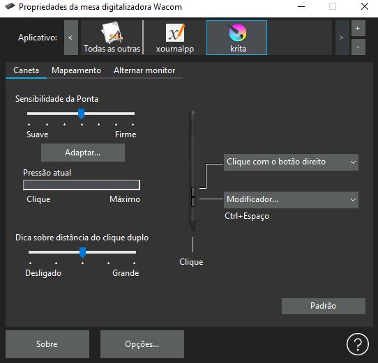 Faça o seguinte: nas “Propriedades” da sua Wacom, clique na aba “Mapeamento” que está entre “Caneta” e “Alternar monitor”. Veja se a opção “usar Windows Ink” está ativada.
