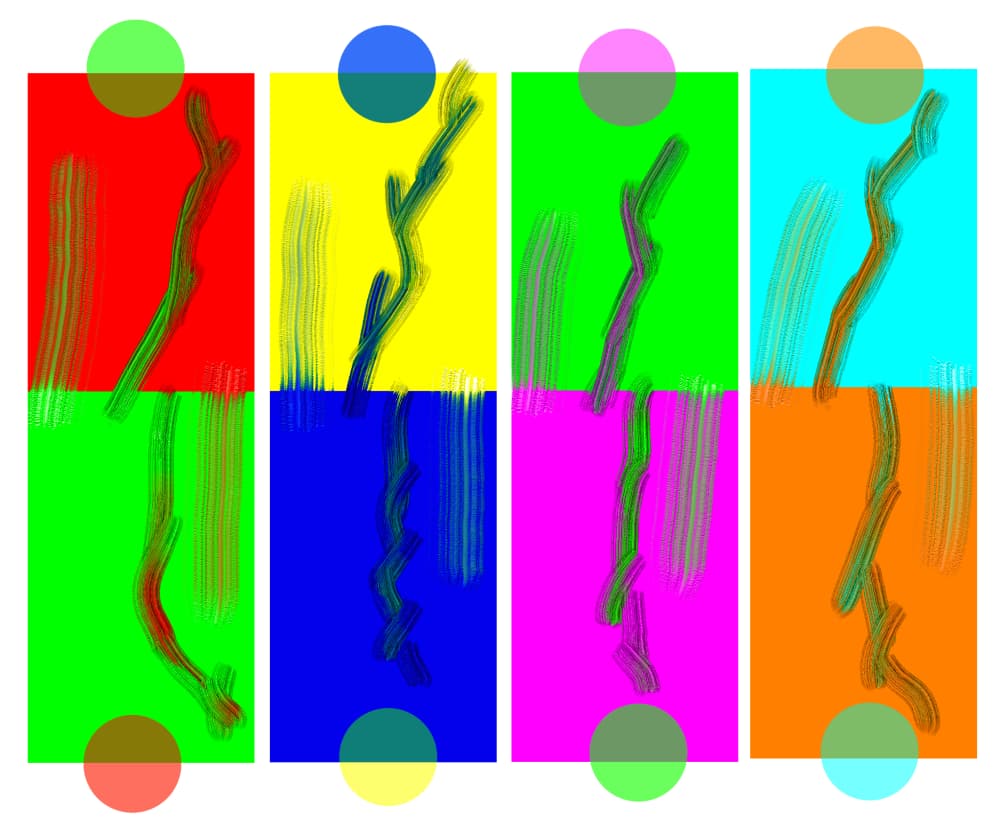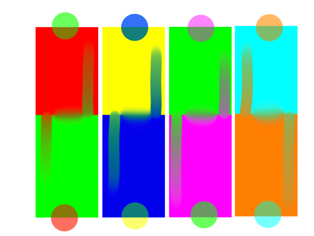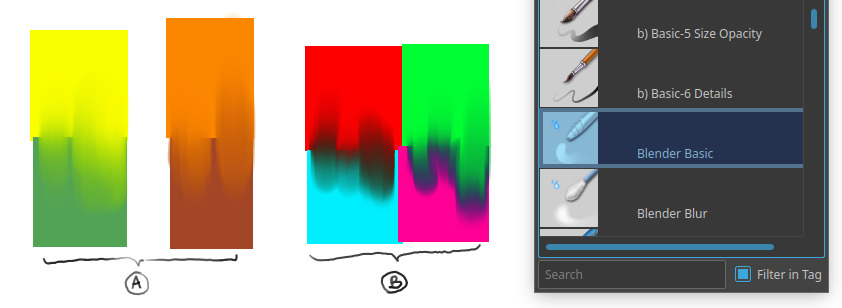Both brush presets works fine when the color are not too far on the spectrum (A), very creamy and delicate. But as soon as I test with color opposed on the RGB hue wheel (B) like Red and Cyan, Green and Magenta, I obtain a very dark color mix also.