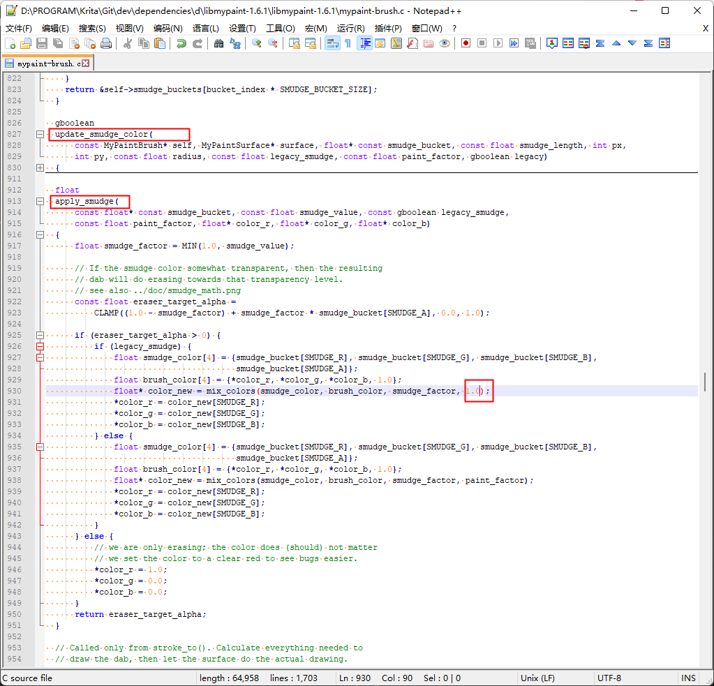 One more thing, we need to modify the code of “update_ smudge_color” and “apply_smudge” in libmypaint, and put legacy_smudge’s calculation method replaced by the spectral mixing algorithm below, and change the “paint_factor” to “1.0”, so that the mypaint brush can fully support spectral color mixing