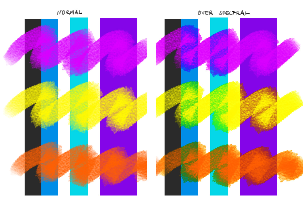 The blending mode both works. Here is how looks color strokes (horyzontal) on a “Spectral Over” layer blending mode over rectangular vertical shape in normal blending mode: