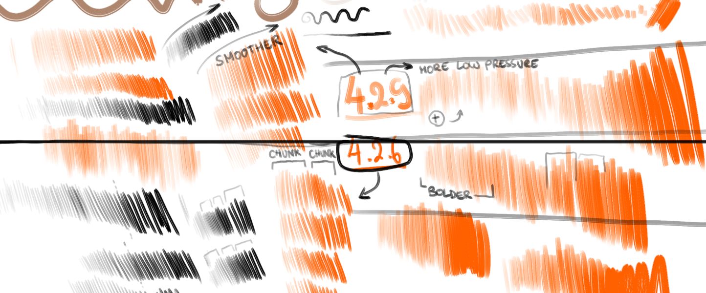 Also, what tiar describes about a recent change I saw, is between 2.4.8 and 2.4.9; and is probably related to something really different. It feels like: or the amount of brush pressure event, or the frequency changed a bit, or the way sensor curves are wrote and read. All in all, I saw only benefits to it because lower pressure and higher pressure are now easier to trigger; as if the systems record this stroke better and before wasn’t (or was skipping a part of the information). All in all, 4.2.6 had tendencies to group “pressure chunk” in the stroke and couldn’t access to the very subtle low pressure input at the initialisation of the stroke while I can get a wider palette of pressure sensitivity in 4.2.9 and that using same tablet, same global pressure curve and same stylus. 4.2.9 has a more “flexible feeling” about the pressure sensitivity. Here is a scribble test in my beta-test folder where I keep track of that type of things (the test is simple: same brush, two colors slots, and trying to do quick stroke verticaly from low to high opacity with only pressure). 4.2.9 on top part of this example under really had smoother and “What you press is what you get” feeling.