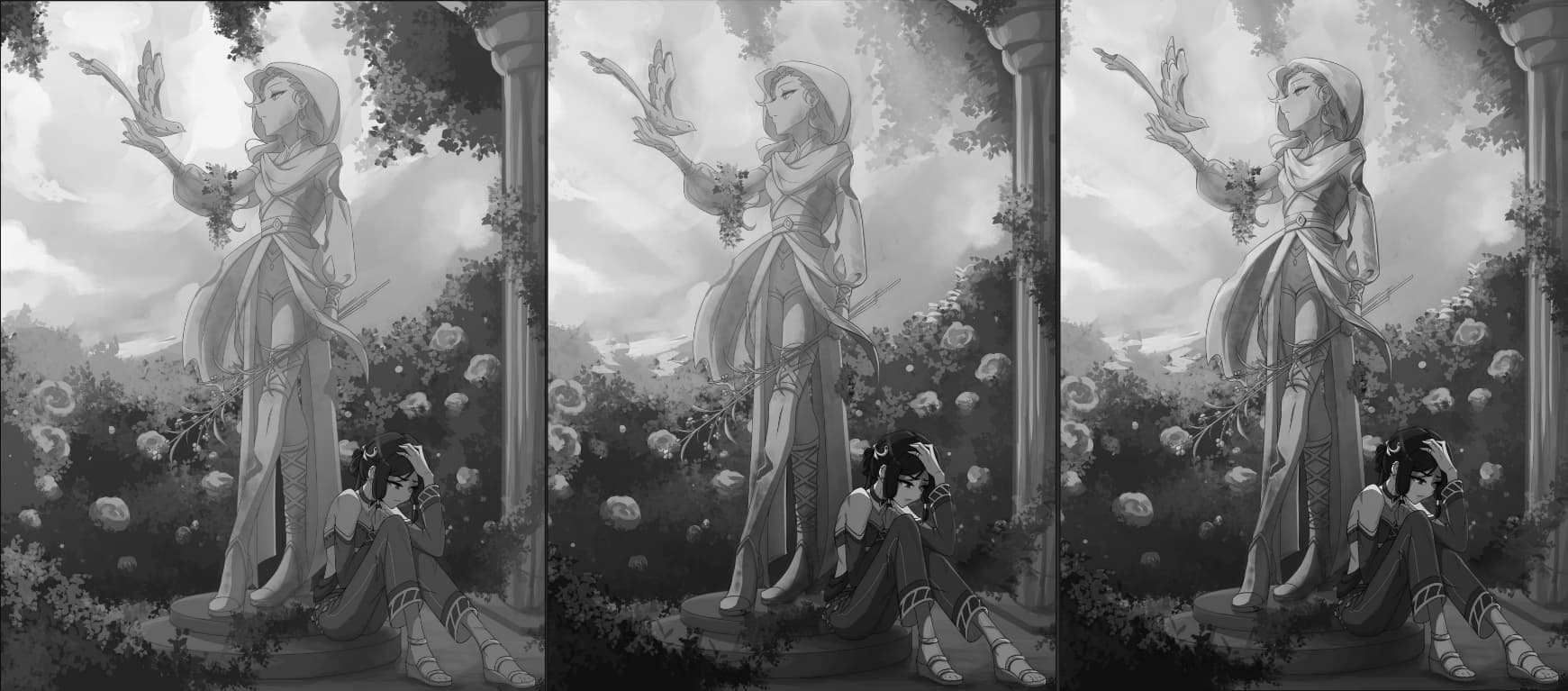 Then I moved the figures around to find a better combination between them. This combination highlights the character more… but the statue’s design gets lost, so it doesn’t seem ideal to me. I only included it to exemplify what I tried to do: