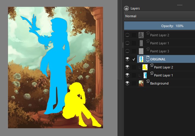 Now… how to change it? You can do some tests with basic shapes and silhouettes. One solution would be to somehow leave the character in the foreground and the statue in the midground.