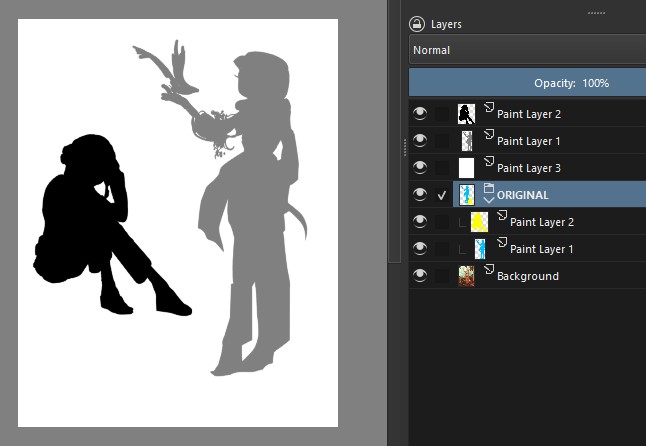 What I did next was based on a tip from a very old drawing course (1950 or earlier, maybe). I traced two silhouettes of the main elements of your art, the statue and the character: