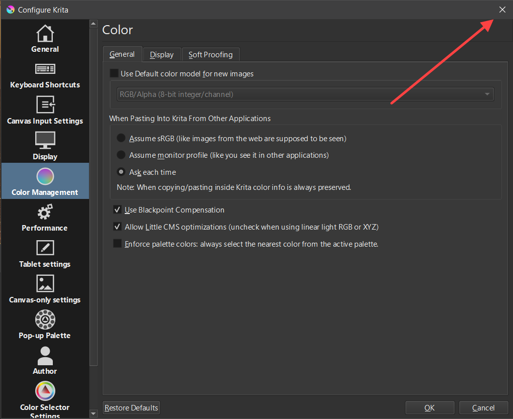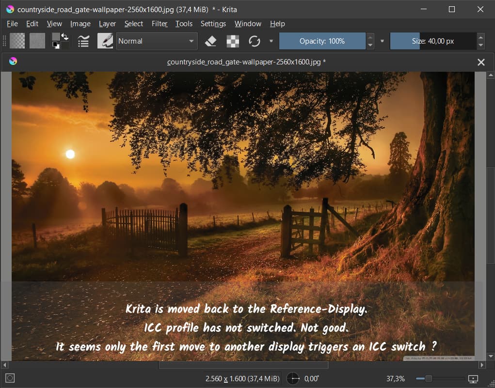 I canât give any advice on the following, but my curiosity forces me to ask this. So what I would still be interested in is if this misadjustment survives a restart of Krita or if Krita after restarting then again âdisplays the correct imageâ, i.e. matching the ICC profile?