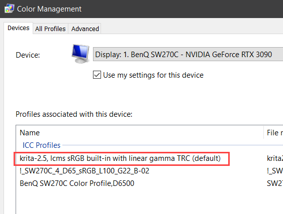 Conclusion / assumption: Krita ignores Windows Color Management settings but uses its own one.