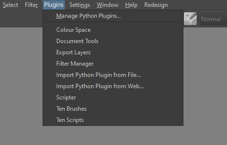 - This raises a question if plugin dockers would be placed under this new Plugins tab or remain under the regular docker menu. There’s valid arguments for both in my opinion and perhaps a matter of personal preference. My suggestion would be to have Scripts and Dockers submenus under this Plugins menu so it is clear they aren’t entirely native to Krita and managed as python plugins.