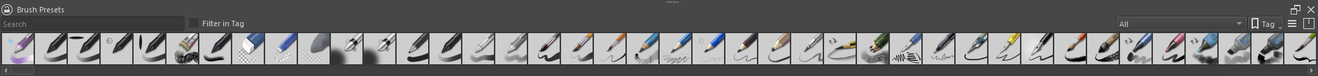 - If you make the Brush Presets docker very short but wide it becomes difficult to scroll through with a tablet pen as the scroll bar. It would be useful if the docker at certain dimensions could switch scrolling direction from scrolling vertically to horizontally. That way you could have your Brush Presets docker horizontally along the top or bottom of the screen while also being able to scroll through the preset list with precision.