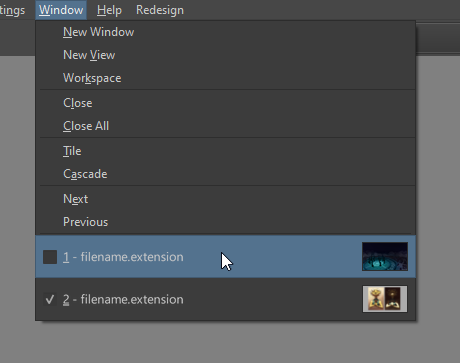 - One thing that would enhance the experience of using subwindows/views is thumbnails for each view in the Window menu. Useful in cases where two documents have a similar name or you have multiple views of the same document for soft-proofing purposes. It would also hopefully reduce the need for including the entire file path in the menu entry.