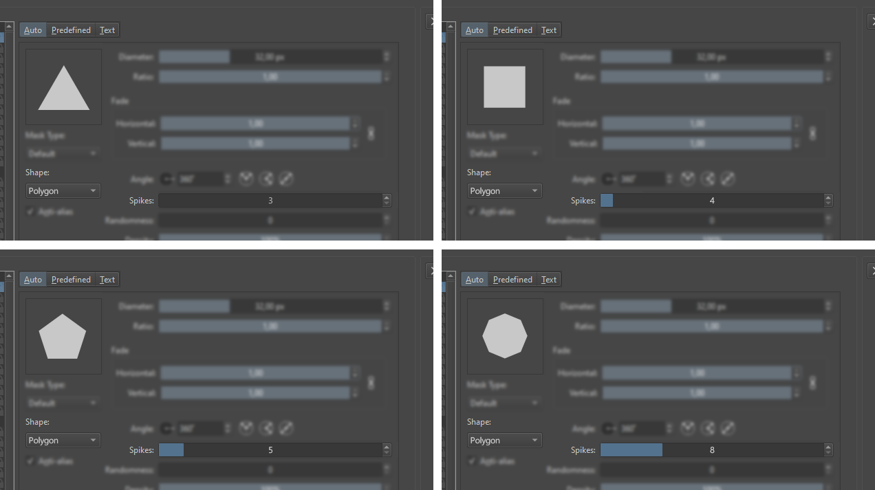 - This could potentially be used to do away with choosing between a Circle and Square brush tip altogether. The user would instead use a slider with a range from e.g. 3-13 to choose the number of vertices/sides for their brush tip. Setting the slider to 13 would change the shown value to Circle and generate a perfect circle the way Krita currently does. I don’t know if this would cause any conflicts with the different mask types though.