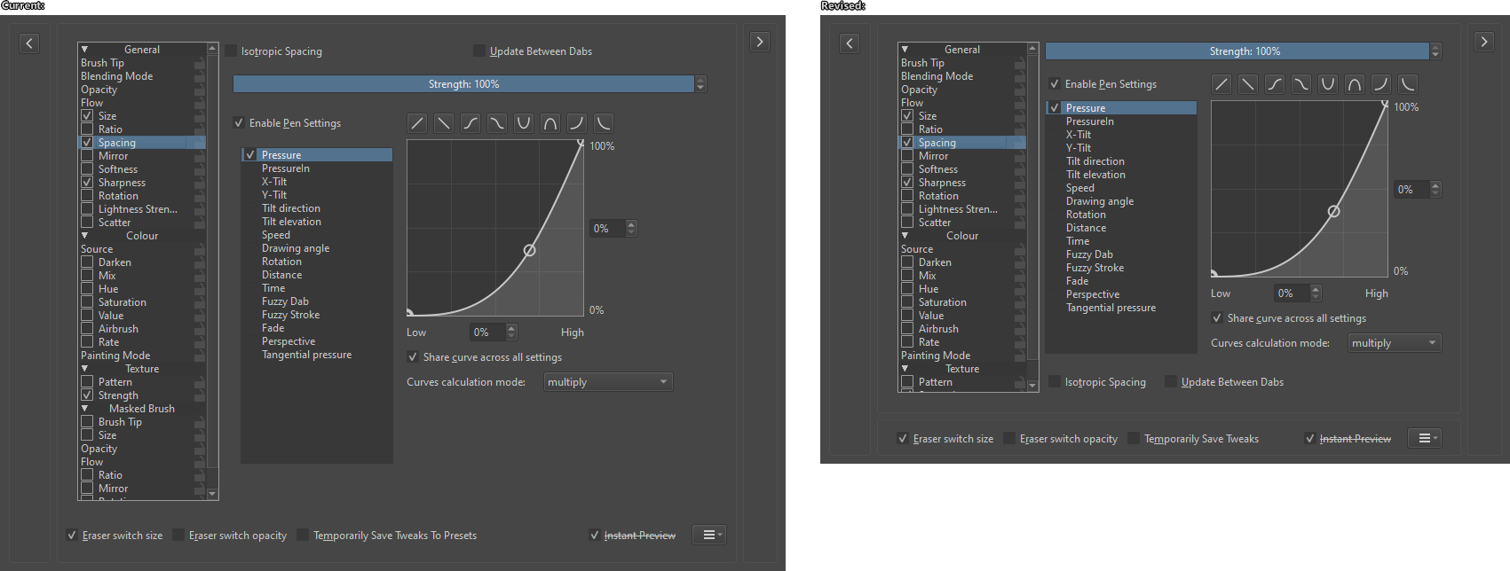 - Some brush presets properties have unique settings (Like Scatter having checkboxes for Scatter amount) at the top of the layout. I feel like they’re better suited to place in the empty space below the settings curve to avoid the UI shifting around when going through different brush properties.