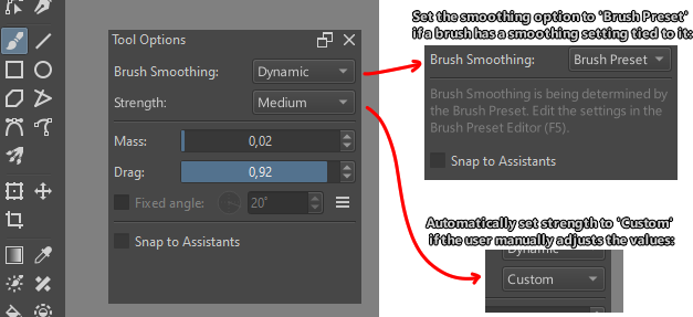 - I also want to suggest extending the brush smoothing feature by offering preset levels of strength for brush smoothing. Not only is this helpful to artists who are just starting to use the feature and are still figuring out what’s comfortable to them, but it also serves as a way of resetting the smoothing settings to a default/working state. The options for the Dynamic Brush Tool in particular are fully open to be set to a virtually unusable configuration with no obvious way for a user to reset them. It’s also helpful to users who are transferring from other software that only does brush smoothing strength this way.