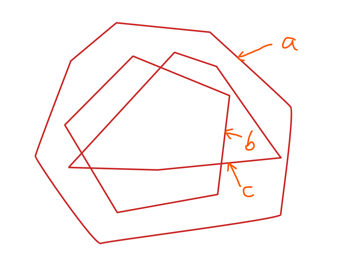 I suspect that ‘a’ was the last path created and so would be above paths ‘b’ and ‘c’.
