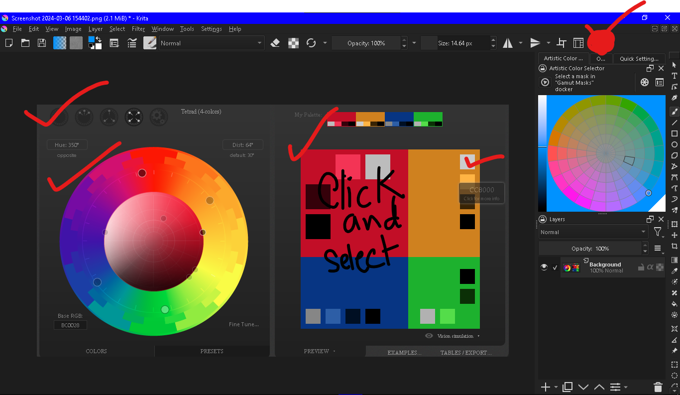 The Interaction color palette also comes with a color wheel. And Krita has a color wheel software on it. Discussed in : Alternatives to Adobe Color: Rickrack - #10 by eigenmiao