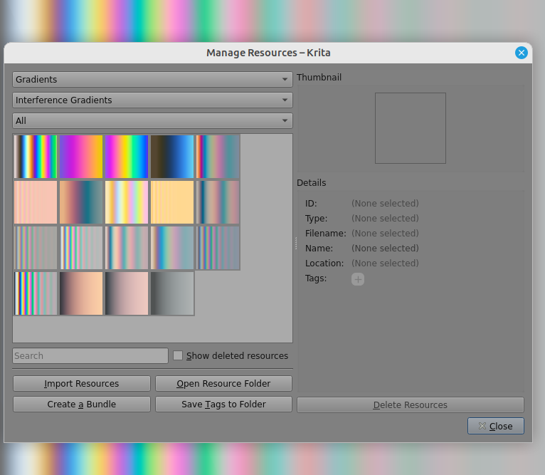I was working on something for Krita, based on work I did on shaders for Blender (see here), when I realized I could create some gradients that have their origin in thin-film interference. So that’s what I did.