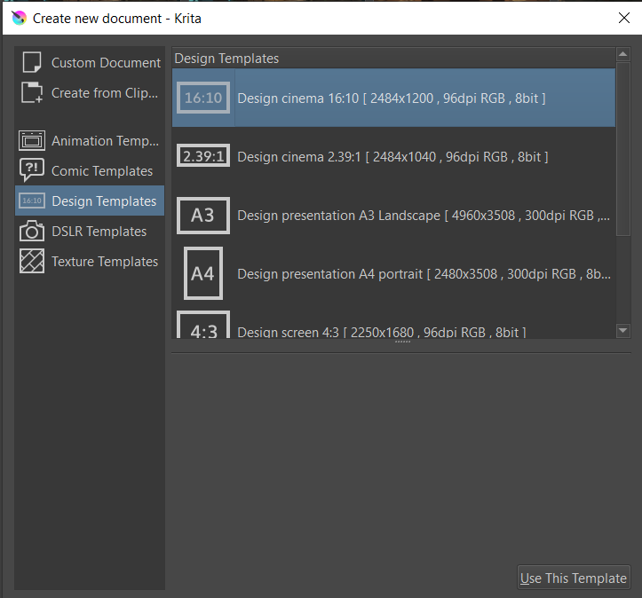 When I create a new document in Krita, it lets me choose from a list of template: