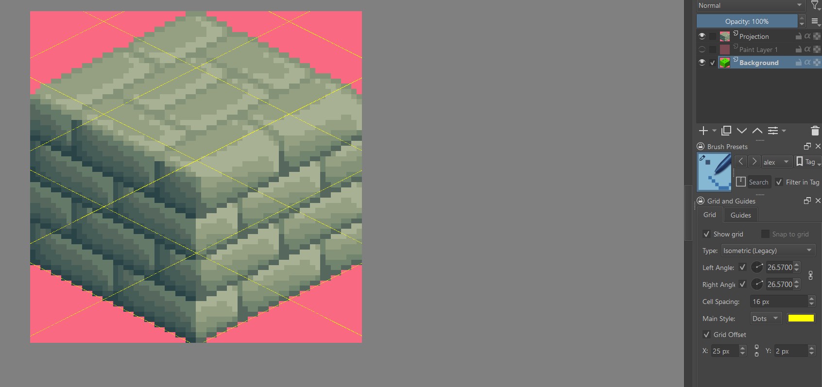 I am only a day or 2 with this, and I’m stuck, I’m either drawing the layer of grids myself now and putting it into background (I will because I already have my brushes setup, i wasted plenty of time by now) or I am finding a different capable software, I don’t plan to babysit Krita, give it coffee in the morning and a massage, it either does the job or something else will do the job. It’s harsh reality, Krita is not up to the task as I see it, why mislead by adding these “isometric” capabilities that don’t work? I don’t know. But all it does it makes me feel stupid thinking I’m doing something wrong, so am I?!