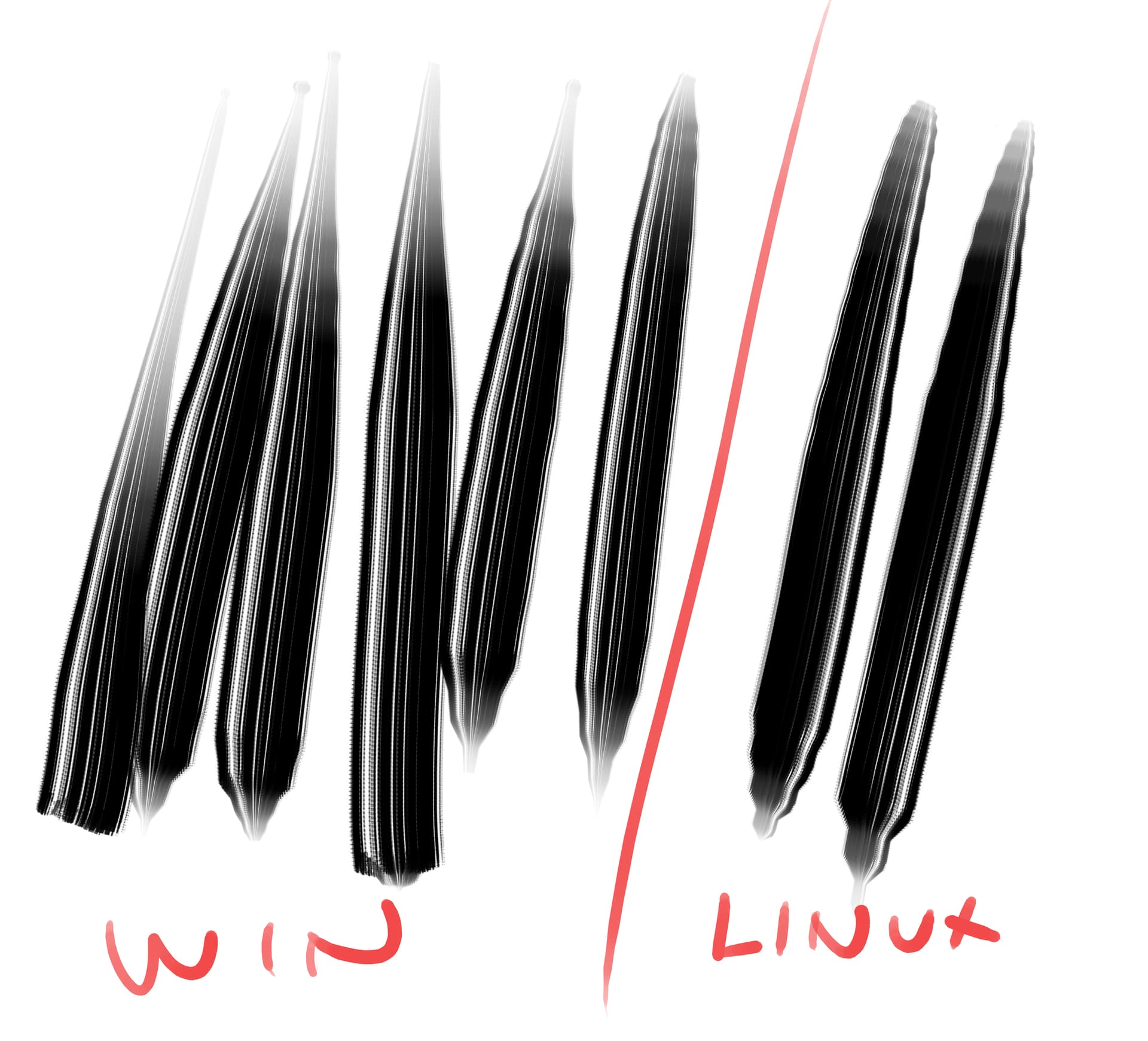 Strokes on left are in Win 10, on the right, Mint 20. There does seem to be some of this unevenness on the Windows ones, too, although much less. Unfortunately the strokes have that other problem I have with the Art pen on Windows; blobs at the start.