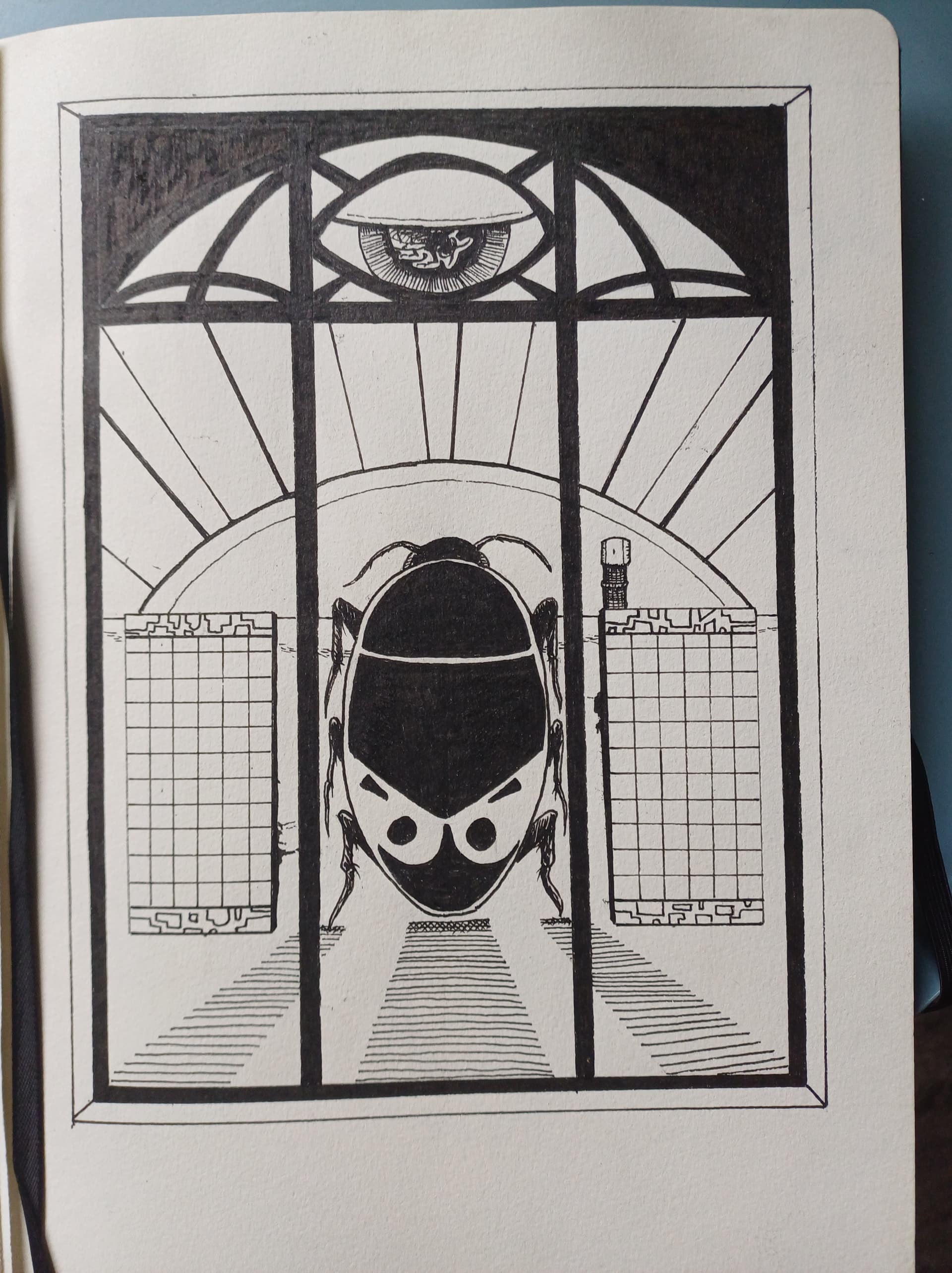 Some hatching practice in the upper corner but also some designs based on a cupboard I chanced upon during a holiday.