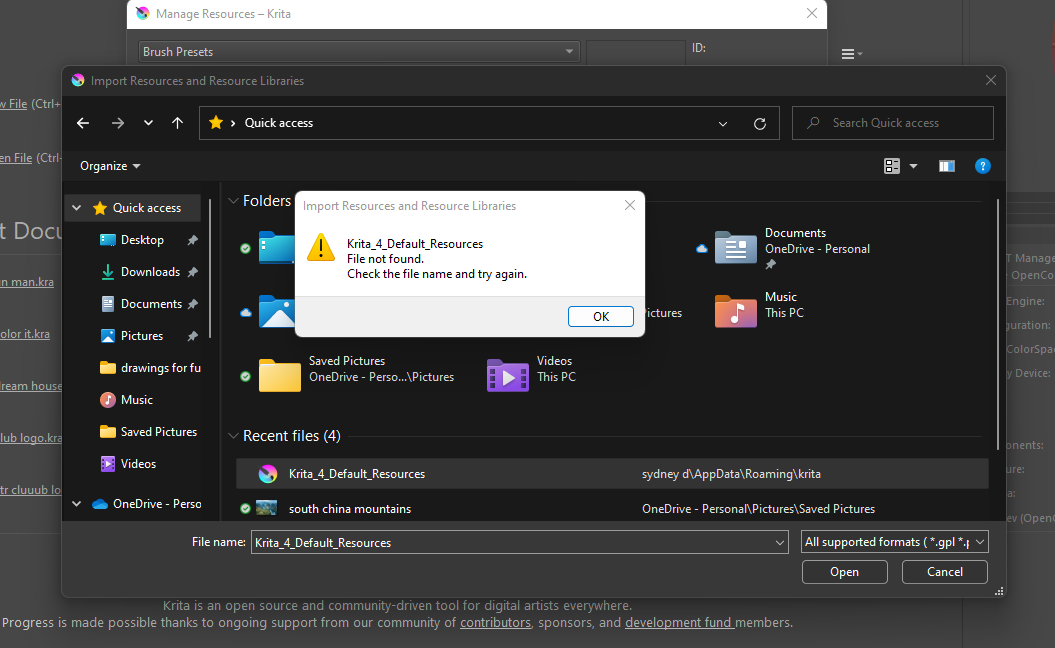 i did try that a few times in different ways before, but it told me that it already existed. it does i can see but i cant put it into krita files for some reason. and then sometimes my computer will say its an unsafe download and just not let me do it entirely.