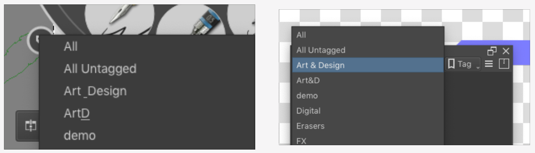 Pop up palette tag selector does not recognize the ampersand character and subsequently does not filter the brush presets (the ampersand character is even not shown in the tag selector of the pop up palette).