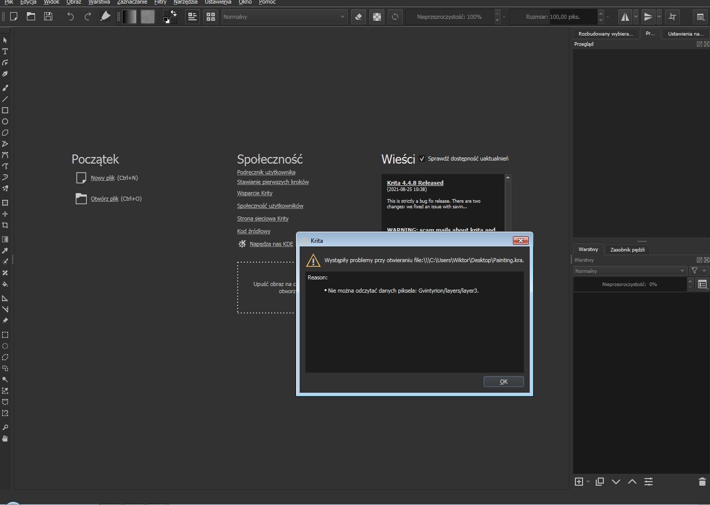 For everyone else: the text in Polish says: “There were issues during opening of …/Painting.kra: Reason: Pixel data can’t be read: Gvintyrion/layers/layer3”.