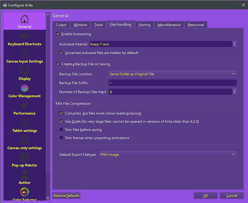 What you can do to create a safety cushion is to activate the setting ‘‘Create a Backup File on Saving’’ in Krita under ‘‘Settings’’ >> ‘‘Configure Krita’’ >> ‘‘General’’ in the ‘‘File Handling’’ tab, you can leave the options ‘‘Backup File Location’’ and ‘‘Backup File Suffix’’ below this as they are or adjust them to suit your requirements, and then specify the number of backups you want to keep under ‘‘Number of Backup Files Kept’’.