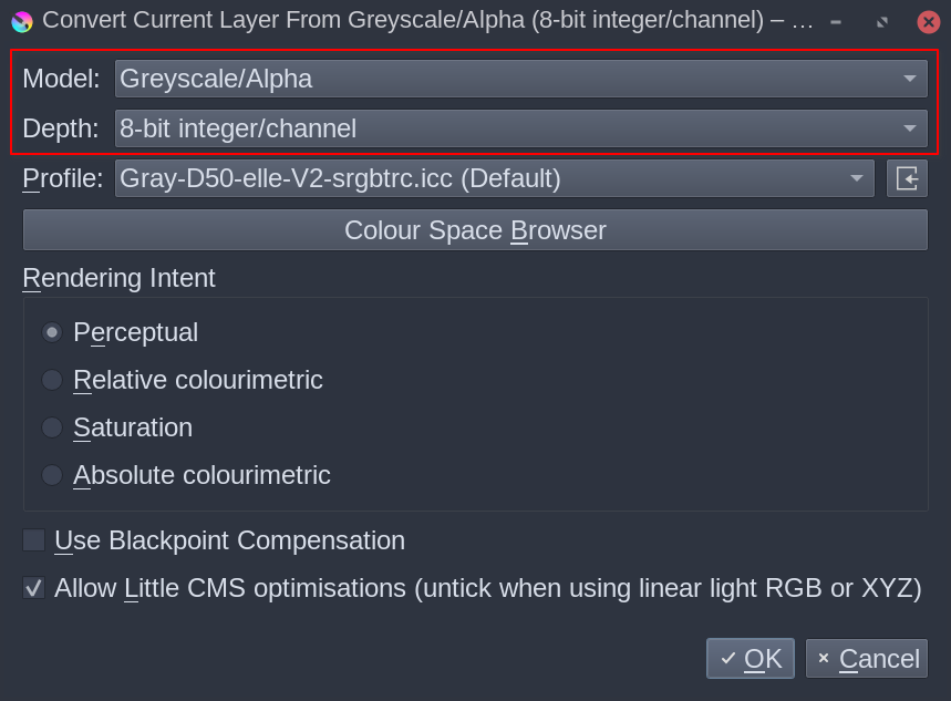 To do that, select your line art layer, and go in menu Layer > Convert > Convert Layer Colour Space…