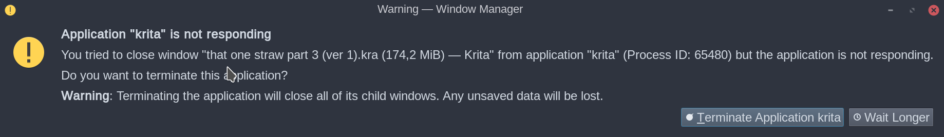 What is strange to me is that my previous animation which I made last year on version 5.1.0 (not entirely sure which version it was, but if it helps, that animation was completed on August 7, 2023) didn’t experience such extensive crashing, and it consists of around 33 layers and is 3.4 GB in size. The only hurdle for that project was the canvas size being too large (It cleared up when I chose 1920x1080, and I’m using the same resolution for my current animation too). Back then, Krita gave me clear warnings about memory running out, but now it just freezes without warning and the only thing I can do is repeatedly press the red X button at the top right corner until a popup tells me Krita is not responding which then lets me close the program (I can’t close the program any other way ). It then runs smoothly for a while but will keep crashing depending on the size (if it’s really bad it’s almost every 5 min, but can be as low as every 15 min).