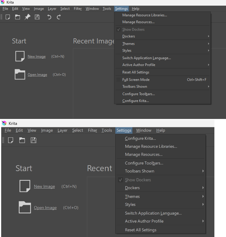 Screenshot attached. At the top is the new, changed menu order, at the bottom the out of the box menu order. What have I done to create that change? How can I revert back to the original menu order, with, for e.g. “Configure Krita” at the top of the Settings menu?