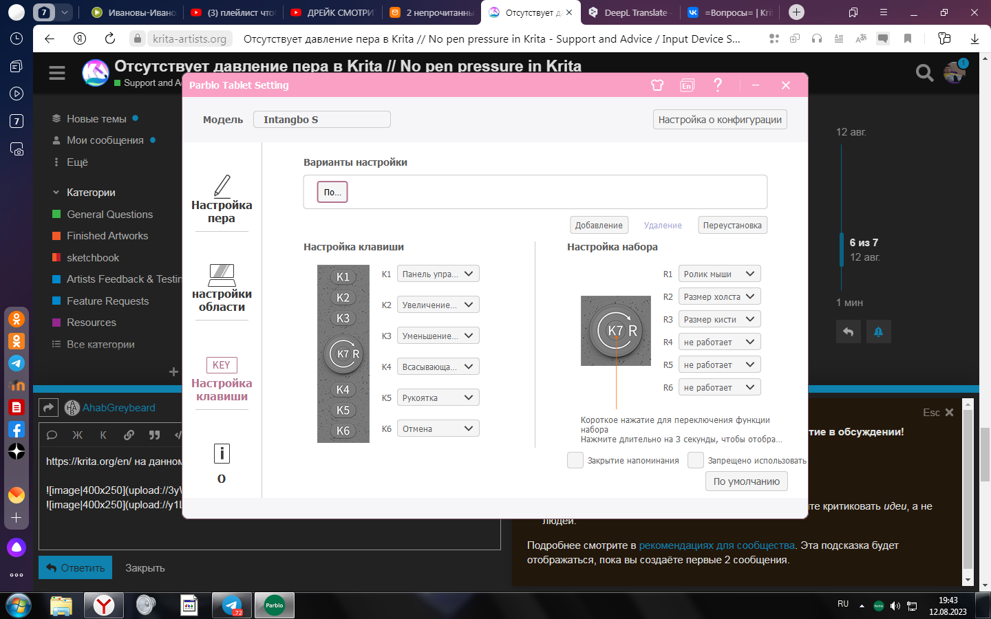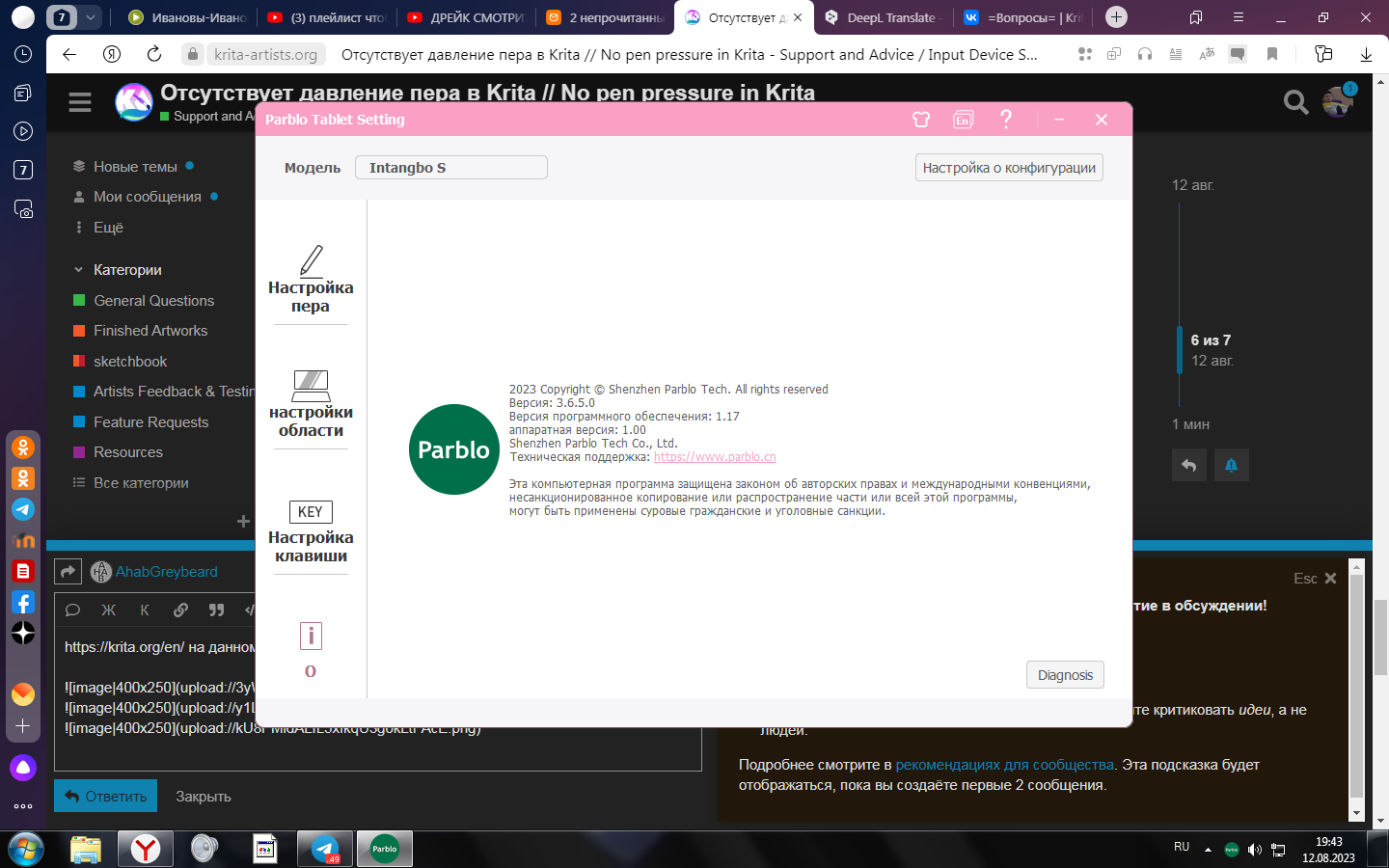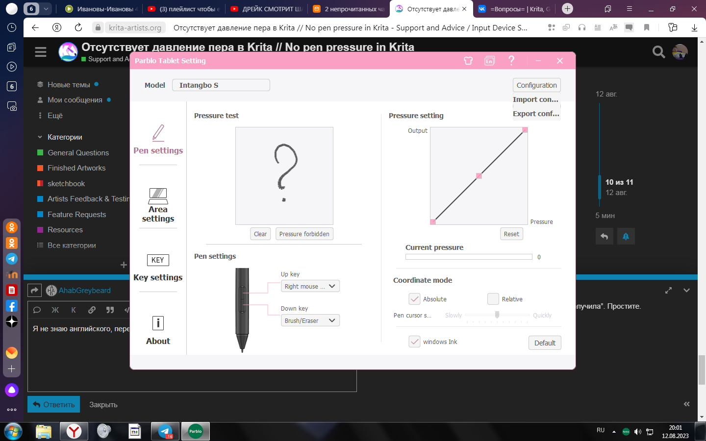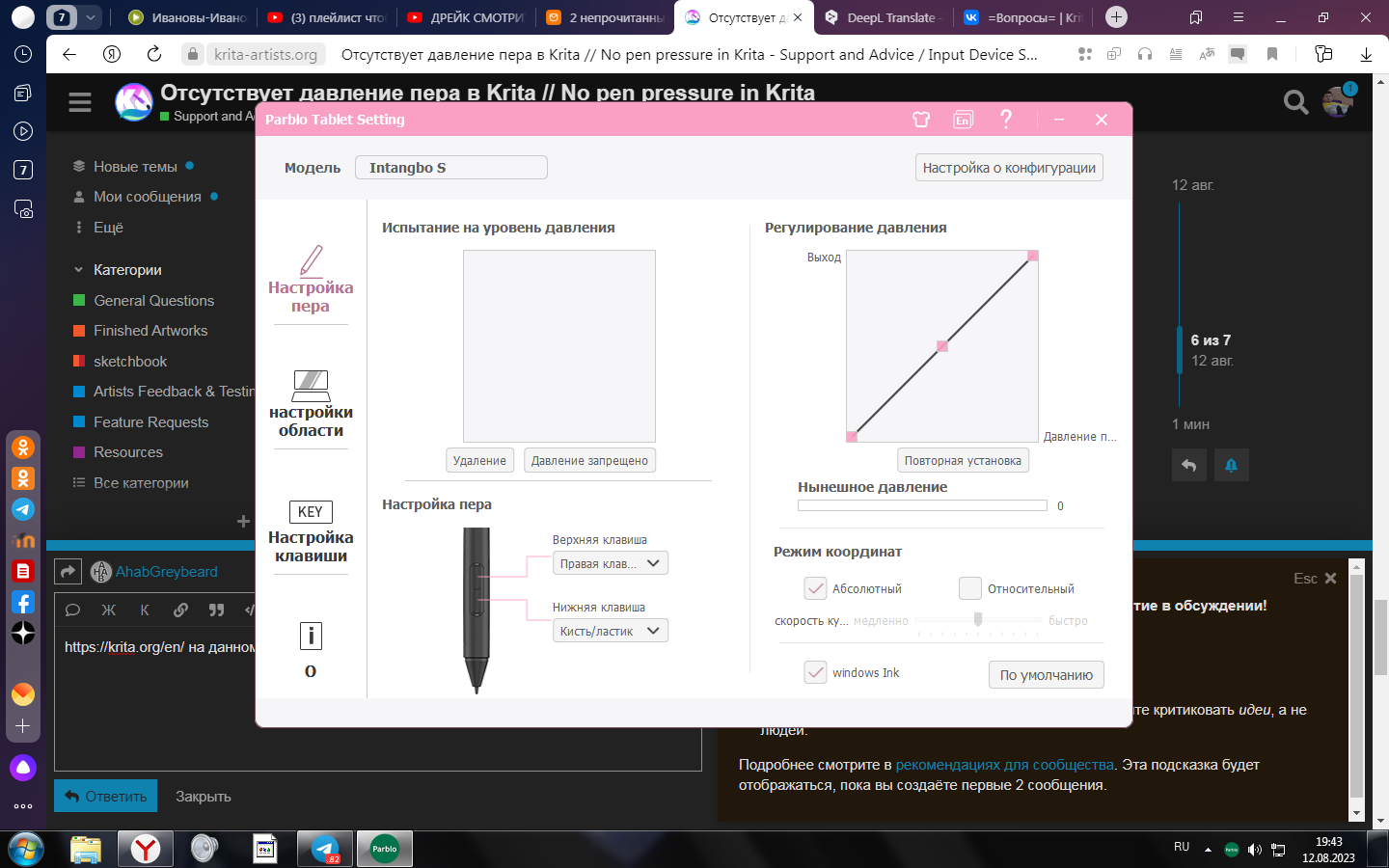@soapo4ka, у меня в сообщении ошибка, в Krita в разделе ‘‘Настройки’’ → ‘‘Настроить Krita’’ в ‘‘Настройках планшета’’ нужно выбрать настройку ‘‘WinTab’’, если в драйвере отключена настройка ‘‘Windows Ink’’.