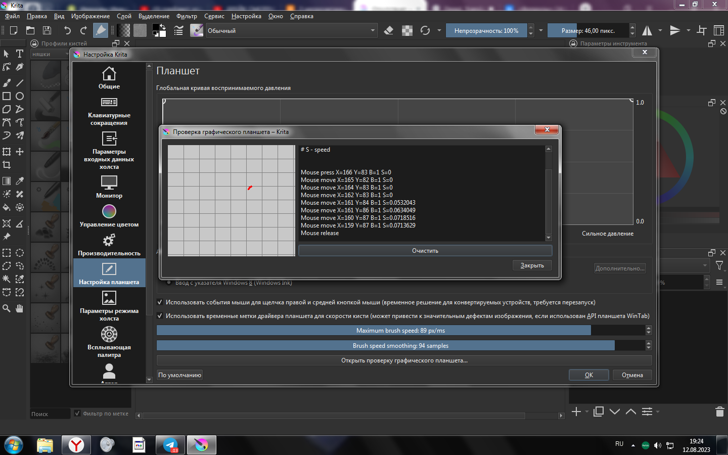 Krita версии 5.1.5 с Windows 7. Графический планшет от Parblo Intangbo S. Я переустанавливала драйвер планшета, меняла версию драйвера планшета, меняла API ввода планшета на «Ввод с указателя Windows 8 (Windows Ink)» и наоборот.
