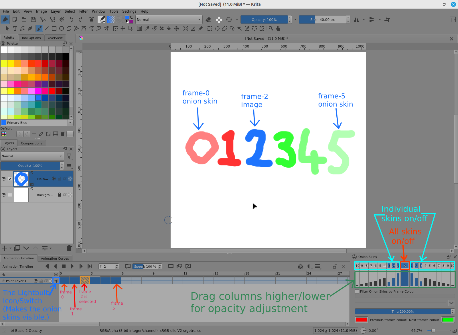Sorry that you have issues understanding Krita’s Onion Skins Docker, but since I’m no animator, I’m not good at helping here. But beside that, you should read up how it works in Krita’s manual, therefore it exists, to explain users how Krita works. The chapter about the Onion Skin Docker is found here: