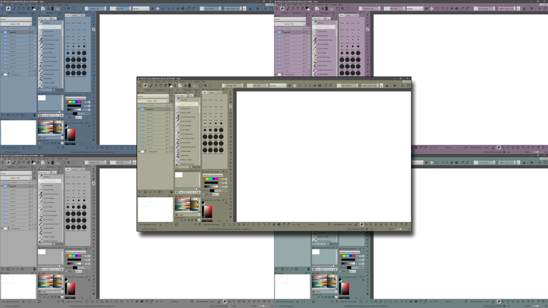 So, in the archives sub-folder themes you have to select and then grab the seven files and drag them from there into the folder color-schemes. Restart Krita twice, select the theme you like, be happy!