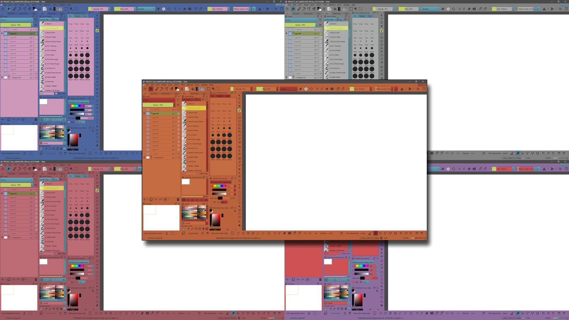 IMPORTANT NOTE: These are color-scheme themes, in your Krita only colors will change using these themes. The screenshots were made with workspace/toolbars/dockers settings greatly modified in my Krita (some of them have been modified to better show how the theme colors will look with different elements).