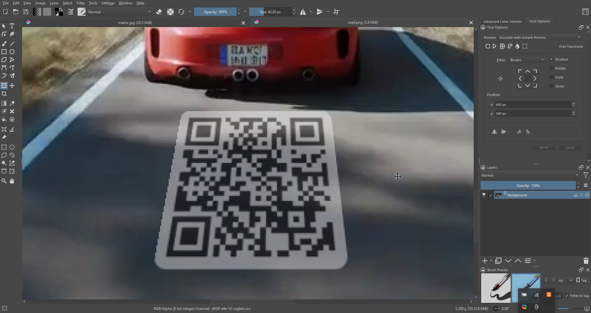 When using the transform tool to rotate a QRCode on a picture (using Ctrl + click) I get aliased edged on the end result, even with bilinear or bicubic. And that makes me a sad panda, especially given I don’t see the same behavior in Photoshop.