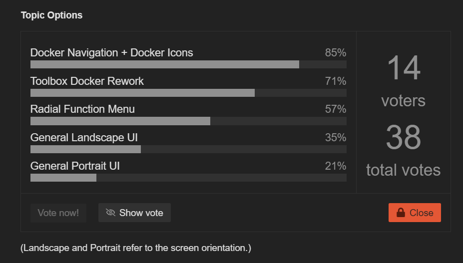 I dont know if my input helps anything, but I’ve been playing with Krita for Android and I’d like to give my insights so far. This is where the UI will need an overhaul the most. The Android port is still a bit raw, and the last month or so it has evolved drastically from “technically usable” to “usable with tweaks” for basic use as a sketchbook.