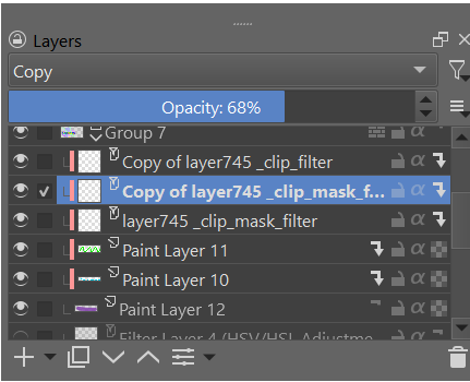 Added clipping for filter layers and pattern (fill) layers. Sad, but clipped filter layers are slower compared to ususal Krita workflow. Layer styles - sadly, but working only for base+clipped layer stack now. I just skip styles for clipped layers now; need to better understand composition rules for them. I’ll look on it later. For now you can add a style to base layer and this will be applied to base layer + its clips.