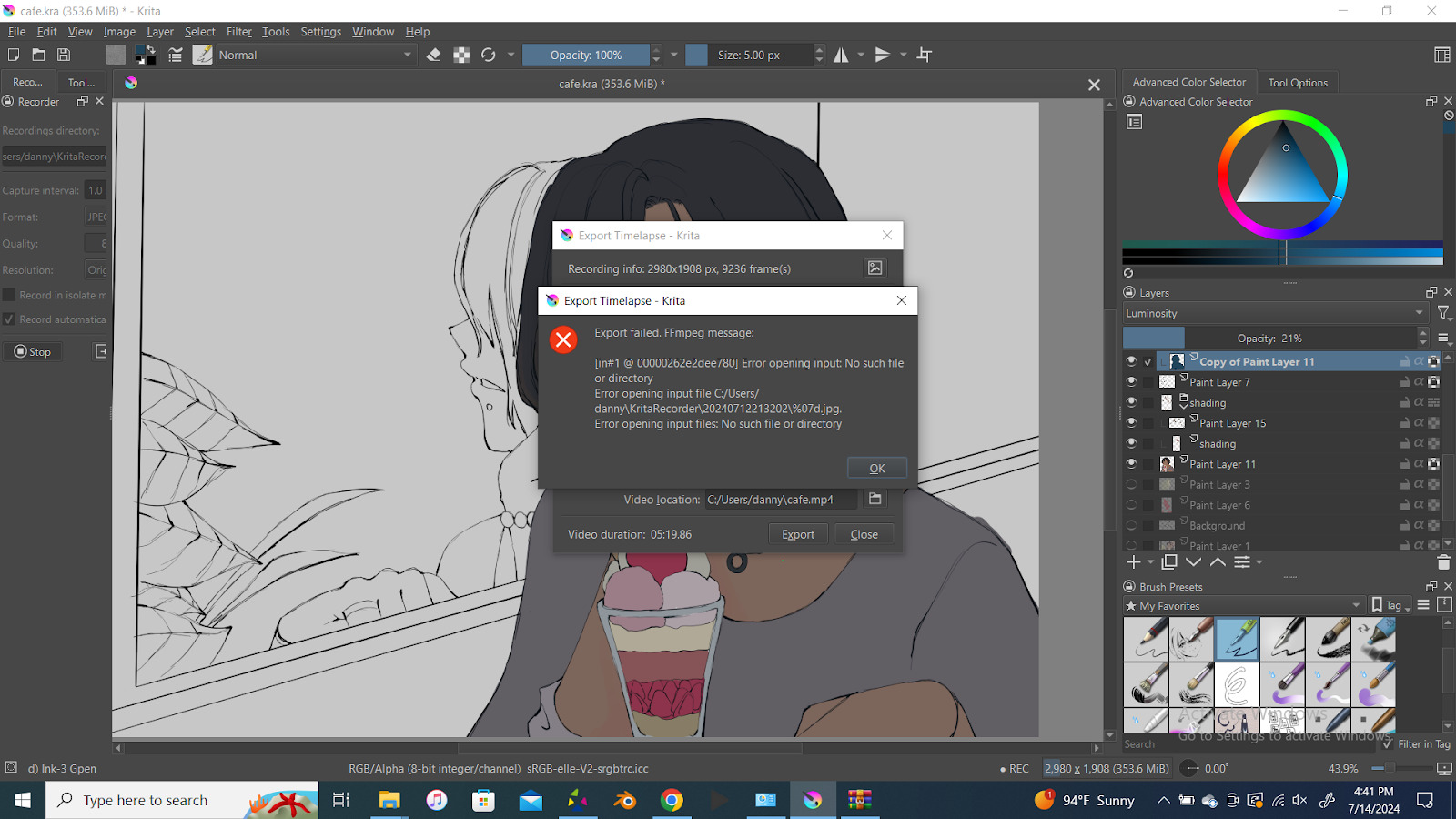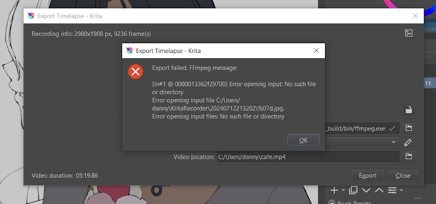 I downloaded krita from the krita website and this is the only error message. It popped up after I tried to use a different ffmpeg file from the ones in the screenshot