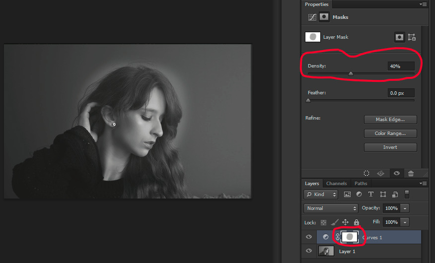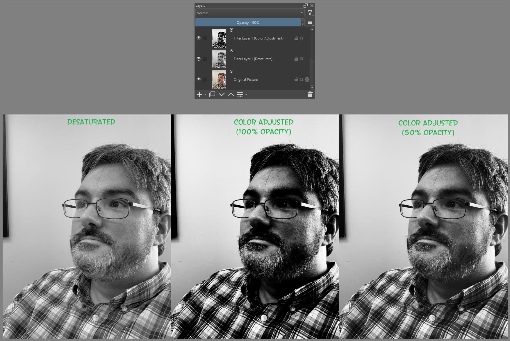 I made adjustments by editing the filter mask exactly as I would a regular transparency mask. I used “Airbrush Soft”, with Opacity of 25% and Size of 150 pixels, for the editing.